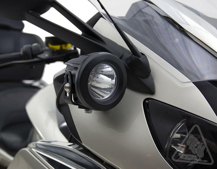 This vehicle-specific driving light bracket makes it possible to mount any Denali choir lamp at the perfect location at the mirror base on your BMW K1600. This location provides optimal visibility without disturbing the design of the motorcycle.