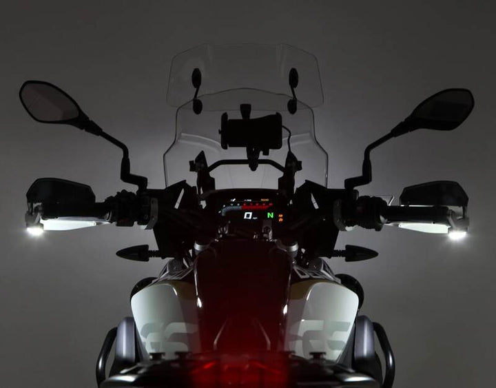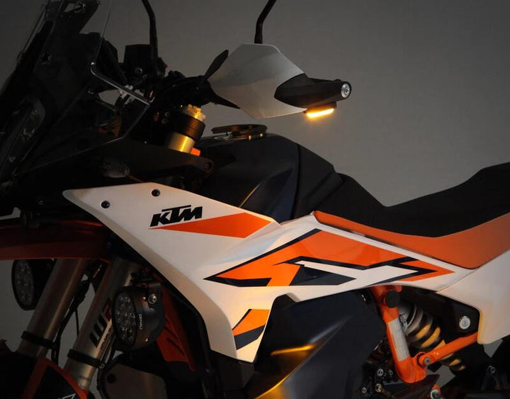 Kits T3 signal capsules mounted on the outside of the hand protection, directed towards the roadway. This creates a light mantle around the entire bike that is visible from all angles - even from the side and from the air.