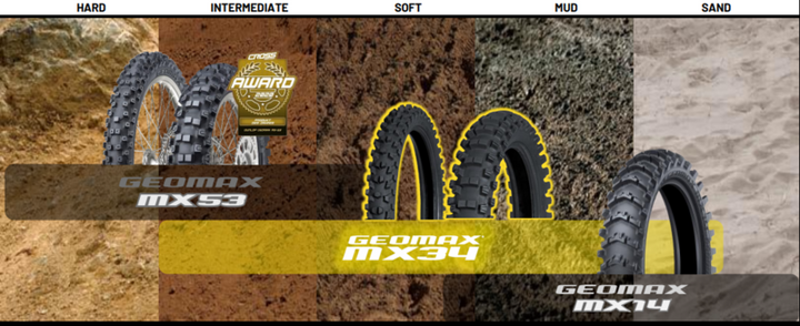 Aspect_ratio: 100.0 Ground: Medium-Soft-Mud Homologation: NHS (Not for Highway Service) Position: Front Rim_diameter: 10 Speed_index: J < 100 km/h Tire_category: MX, SX Tire_family: Motorcycle & Scooter Tires Tire_load_index: 33.0 Tire_pattern: GEOMAX MX34 Tire_Structure: X-Ply Tire_width: 60 Tubeless_or_Tubetype: TT - Tubetype Tyre_compound: Mid-soft