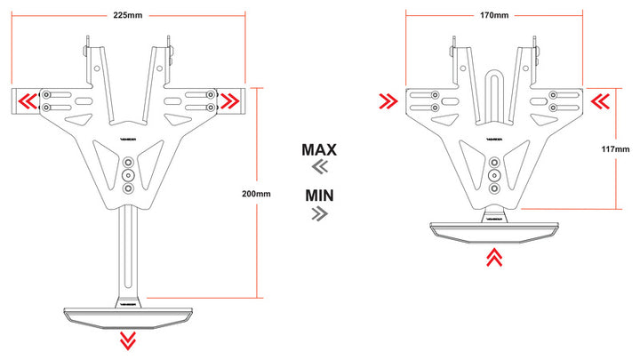 This license plate holder is made of 2 mm laser-cut steel plate, powder-coated black for weather resistance and long durability. The angle of the plate can be adjusted steplessly, and an extra locking screw keeps it securely in place. The width-adjustable indicator mounts have 10 mm side-mounted holes, so you won’t have to cut the wires – quick and smooth!