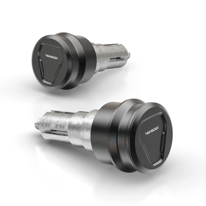 Steep and Flat Trapezoids Form The Basic Shape of the Highsider Esagano-Ls Handlebar Ends CNC Machined From Aluminum and Create a Futuristic Design, Which Thus Symbolizes The Design Language of Modern Motorcycles. A Visual Highlight is the cover in which the hexagonal basic shape of our esagano-RS Mirror Series is CNC-Machined. This Gives The Bar Ends A Closed Appearance, Free of the Bolt Head. The cover is attached via A Grub Screw in the Invisible Area of ​​the Base Housing. The esagano-ls handleable ends are suitable for mounting our extensive product range of handleable end mirrors with a stem width of 12mm. Find also you the optically matching mirrors for your bike. About our high-quality and included sleeve system made of aluminum, the bar ends can be mounted on a variety of handlebars with different inner diameters force-fit.