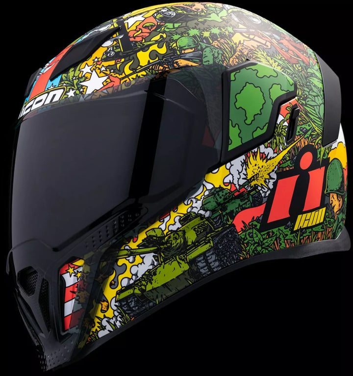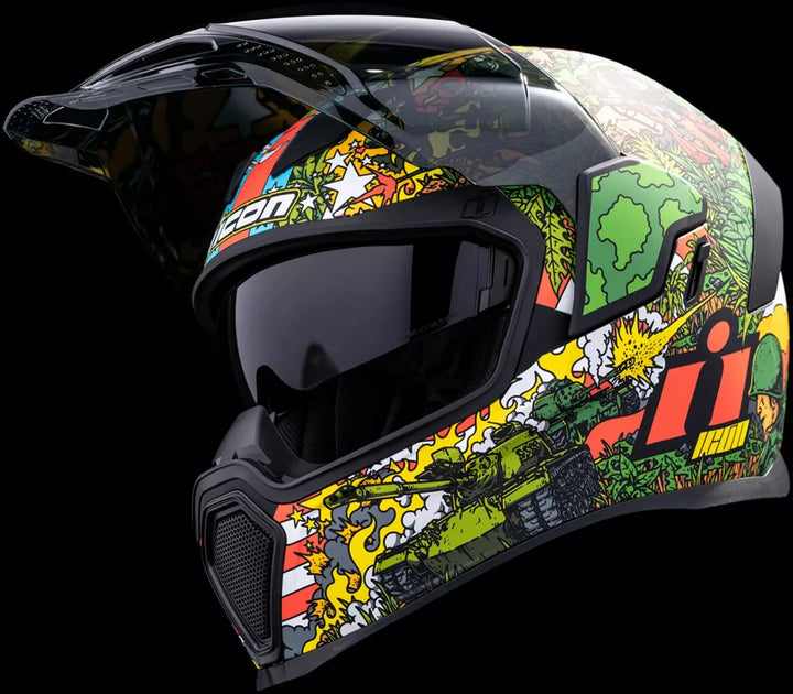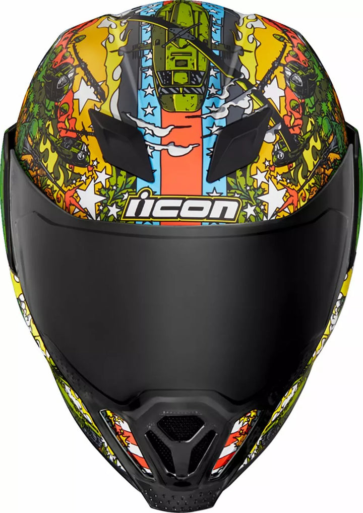 Quick-Change Fog-Free Fliteshield ™ with Sideplates, Injection Molded Polycarbonate Shell for Strength, Multiple Oversized Intake and Exhaust Ports, Fog-Free Dropshield ™ with Exterior Switch, Removae, Removable Mold. Supervent Cooling System, Internal Speaker Pockets Work with Icon's R.A.U. Bluetooth Device, The Dropshield ™ Visor Must Only Be Used While The Main Face Shield Is In The Fully Closed Position, Removable Hydradry ™ Moisture Wicking Liner, Includes Clear Fliteshield ™ & Dark Smoke Smokes Deps.