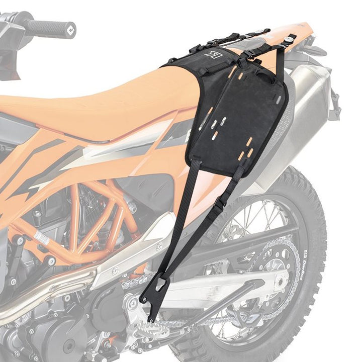 Designed to fit perfectly on KTM 690, HUSQVARNA 701 & GASGAS 700 with a custom shape and specific fit. The OS-BASE is an "over the seat harness" for mounting OS-6, OS-12, or OS-18 ADVENTURE PACKS as soft bags, without the need for metal frames. This system provides a super tough, lightweight carrying solution, with only minor modifications to the body needed. The mounting hardware offers the flexibility to install a single, double, or triple pack setup, depending on your ride. The fixed-length straps make installation quick and easy, and the custom shape provides a snug, secure fit with plenty of clearance from the exhaust and fuel filler. It takes less than a minute to install and just seconds to remove it.
