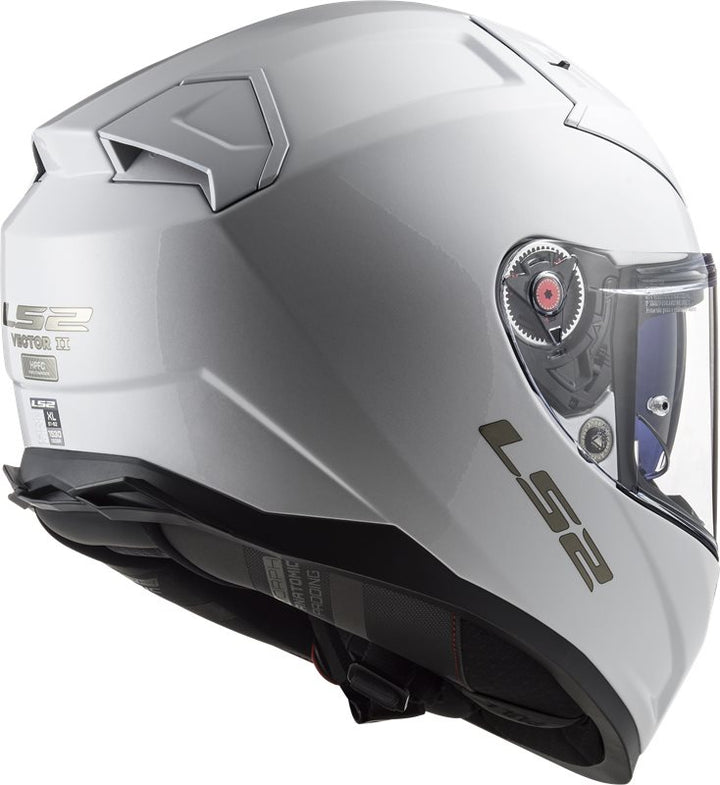 Baksida av LS2 Integral Mc-Hjälm Vector II Vit med logotyp och ECE R22.05-certifiering för hög säkerhetsstandard.