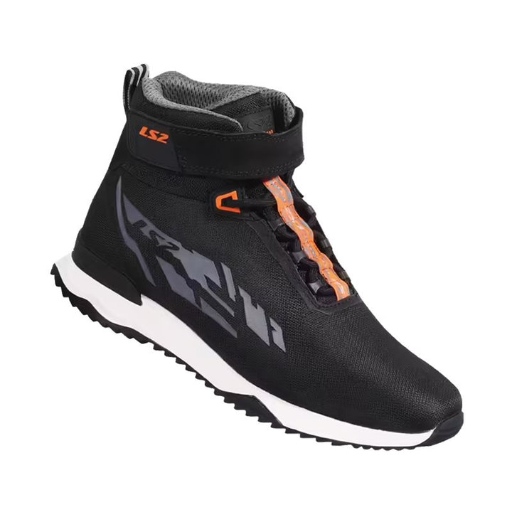 LS2 Mc-skor Acrux i svart och orange med slitstark design och halksäker sula. Perfekt för motorcykelförare som söker stil och säkerhet.