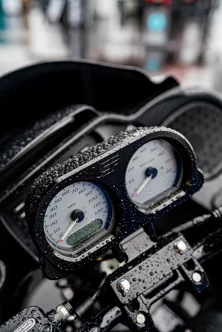 Specific-fit to slyfox risers with top mount bracket (risers sold separately), can mount in front or back of risers, adjustable tilt, compatible with stock gauges and dakota digital gauges for models/years listed, made in the USA