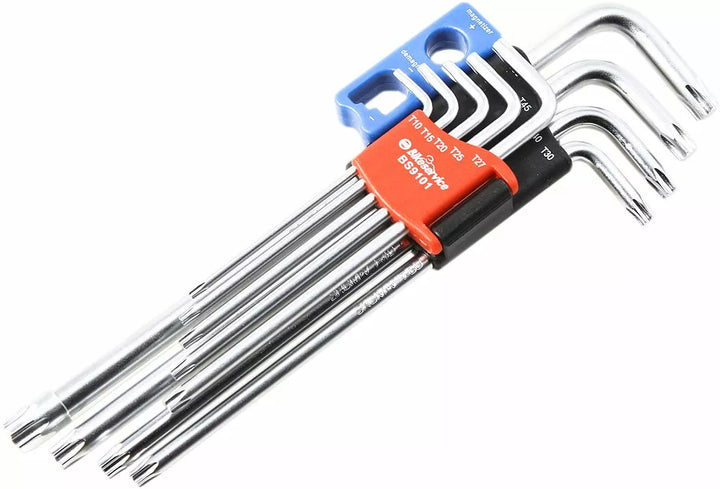 Längere Längenschlüssel für zusätzliche Hebelwirkung und erweiterte Reichweite. Ein anderes Ende des Schlüssels ist für Manipulationsbefestigungen, TX-Star-Größen ausgelegt: T10, T15, T20, T25, T27, T30, T40, T40, T45 und T50