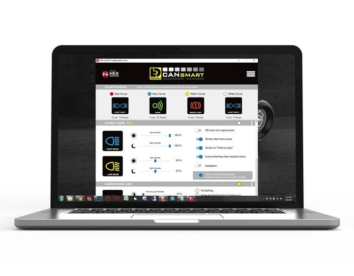 Wenn die direkte Steuerung der Helligkeit während der Fahrt wichtig ist, wird der DENALI DialDim™ Controller empfohlen, der parallel zu CANsmart™ verwendet werden kann – z.B. um zwei Sätze von Zusatzscheinwerfern über DialDim zu steuern und CANsmart™ das Horn, Bremslicht oder andere Zubehörteile verwalten zu lassen.