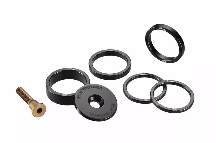 Starten Sie Ihre Fahrt mit E*Thirteen's Top Cap & Headset Spacer Kit! , Reduzieren Sie das Gewicht und fügen Sie einen High-End-Stil hinzu, während Sie Ihr Cockpit fein abtun. , Erleben Sie eine erhöhte Kraft und Leistung mit anodierter Legierungs -Top -Kappe und 7075 Al Bolt. Die leichte Top-Legierungskappe mit niedriger Profile integriert sich perfekt in E*Dreizehn Stängel, ist jedoch auf den meisten Stielen auf dem Markt gleichermaßen zu Hause. , Bolzen werden in Farben brillant anodiert, um E*dreizehn Stielen und andere Komponenten zu entsprechen. , T25 -Hardware bedeutet einzelne Tool -Anpassungen eines Teils Ihrer E*Dreizehn Balken-/Stammbaugruppe. 5 Schwarz Anodized Alloy Headset -Abstandshalter in mehreren Größen ermöglichen die endgültige Flexibilität bei der Anstiegsanpassung. , Größe: 34,8 mm Durchmesser., Gewicht: 33 g/Kit.