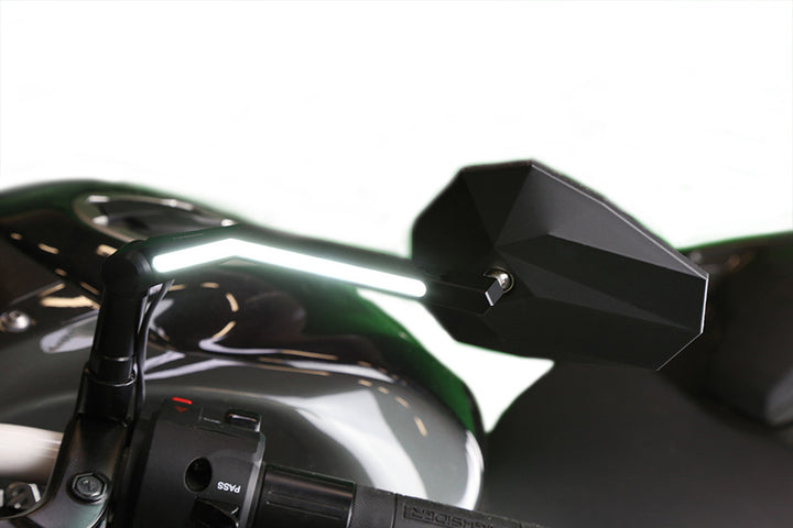 Halte dich im Verkehr sichtbar! Positionslichter sind eine effektive Möglichkeit, von anderen Verkehrsteilnehmern gesehen zu werden. Die Silhouette des Motorrads wird visuell verbreitert, was die Erkennbarkeit verbessert. Um dies zu erreichen, haben wir unseren Highsider STEALTH-X3 Spiegel mit einem starken LED Positionslicht ausgestattet. Im Gegensatz zu traditionellen Spiegeln, bei denen die Beleuchtung im Spiegelkopf integriert ist, haben wir das Licht elegant in den Spiegelarm eingefügt.