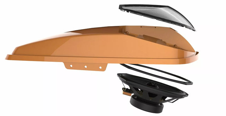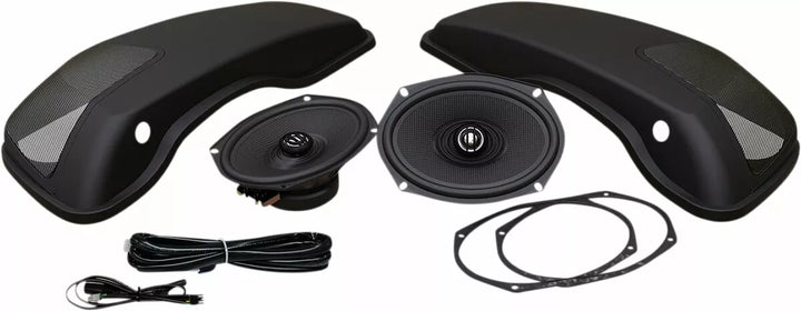 Die Lautsprecher, die zum besten Sound in Richtung Fahrer abgewinkelt sind, umfassen 200 Watt 2 Ohm XL Serie 6x9 ヤ Lautsprecher, die für die Motorradumgebung hergestellt wurden, Lautsprecher verfügen über Kohlefaser-Tieftönerkegel, bessere Bassreaktion mit höherer Leistung) Fabrik-Latch/Sperrmechanismus in neue Deckel, eingebaute Wasserentwässerungssysteme hält alles trocken. Erforderliche Hardware ist inklusive Hogtunes -Verstärker oder andere Verstärker. Für den ordnungsgemäßen Betrieb ist ein Verstärker erforderlich