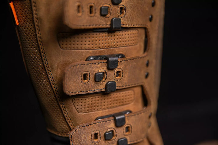 Premium-Leder-Obermaterial kombiniert mit Öl/Schlupf-resistenten Außensohlen für robuste Stil, fünf STRAP-Chassis ermöglichen eine bequeme Passform, Seitenrückfälle für die einfachen und ausgeschalteten, harten, verstärkten Schienbeinplatten und wirkungsbeständige Nylonschnalel, interne D3-Fahrt.