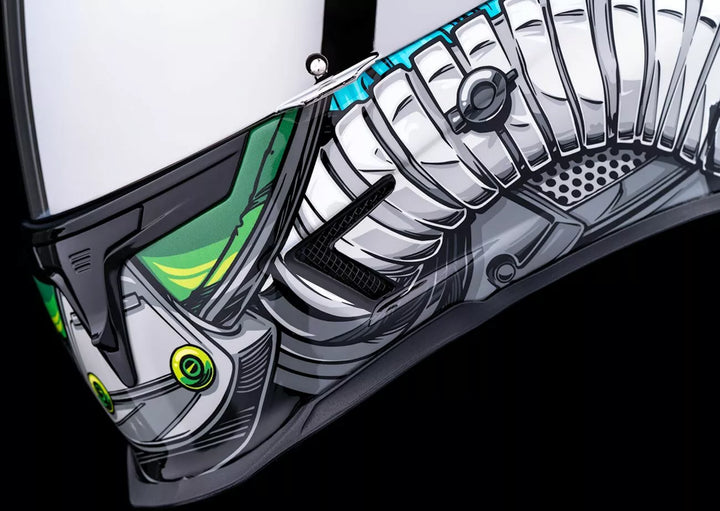 Icon Optics ™ Visiret ist beides Immre und schnell austauschbar dank der Smart Rapid-Release ™ -System. Der Helm kommt mit beiden Klares Visier Und eins Erst Silbervisor Um sich an die Beleuchtungsbedingungen anpassen zu können.