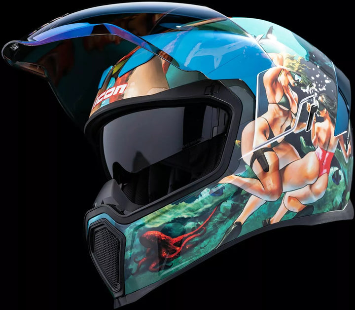Injektionsform geformte Polycarbonatschale für Festigkeit, schnell änderungsfreies Fliteshield ™ mit Seitenplatten, eingeborenem Twin-Kanal-Kühlsystem, abnehmbarer geformter Atemdeflector und Kinnvorhang, mehrfach übergroße Einnahme und exversidierte Aufnahme. Außenschalter, das DropShield ™ Visor darf nur verwendet werden, während sich der Hauptgesichtsschild in der vollständig geschlossenen Position befindet, abnehmbare Hydrady ™ -Feuchtigkeitsdocht -Liner, interne Lautsprecher -Taschen funktionieren mit Icons R.A.U. Das Bluetooth -Gerät umfasst Clear & RST Blue Fliteshield ™, einschließlich Dark Smoke Dropshield ™
