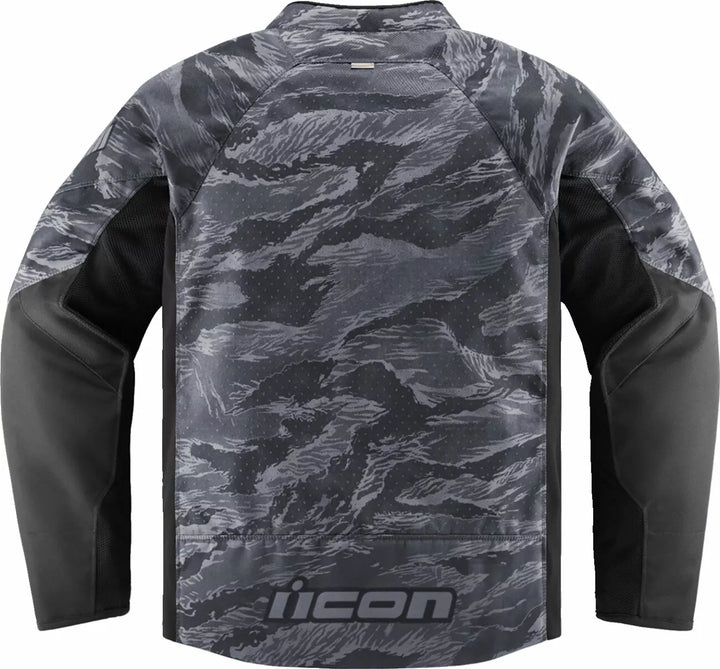 Die Jacke basiert auf dem Sport -Fit -Muster von Icon und besteht aus einem 300D -Polyester -Chassis. Iron Weave ™ Mesh -Panels werden in strategischen Bereichen, einen signifikanten Anstieg des Luftstroms, D3O® -Impact -Protectors in den Schultern, Ellbogen und Rücken platziert.