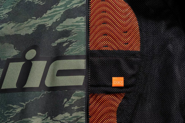 Die Jacke basiert auf dem Sport -Fit -Muster von Icon und besteht aus einem 300D -Polyester -Chassis. Iron Weave ™ Mesh -Panels werden in strategischen Bereichen, einen signifikanten Anstieg des Luftstroms, D3O® -Impact -Protectors in den Schultern, Ellbogen und Rücken platziert.