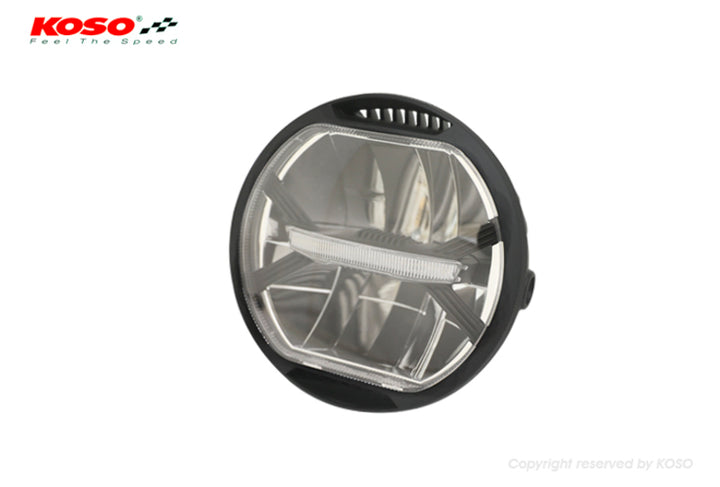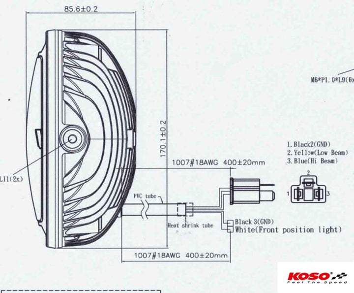 Koso -LED -Scheinwerfer Thunderbolt 170 mm Durchmesser von 170 mm; Tiefe von 86 mm mit Glasklemme mit zwei M8 -Schrauben auf der Seite DC 12 V 15,1W auf High Beam9.7W auf Antriebsstrahl 4,6 W auf Positionlichter 3 Stecker: Schwarz: Groundyble: High Beamblue: Antriebsstrahl