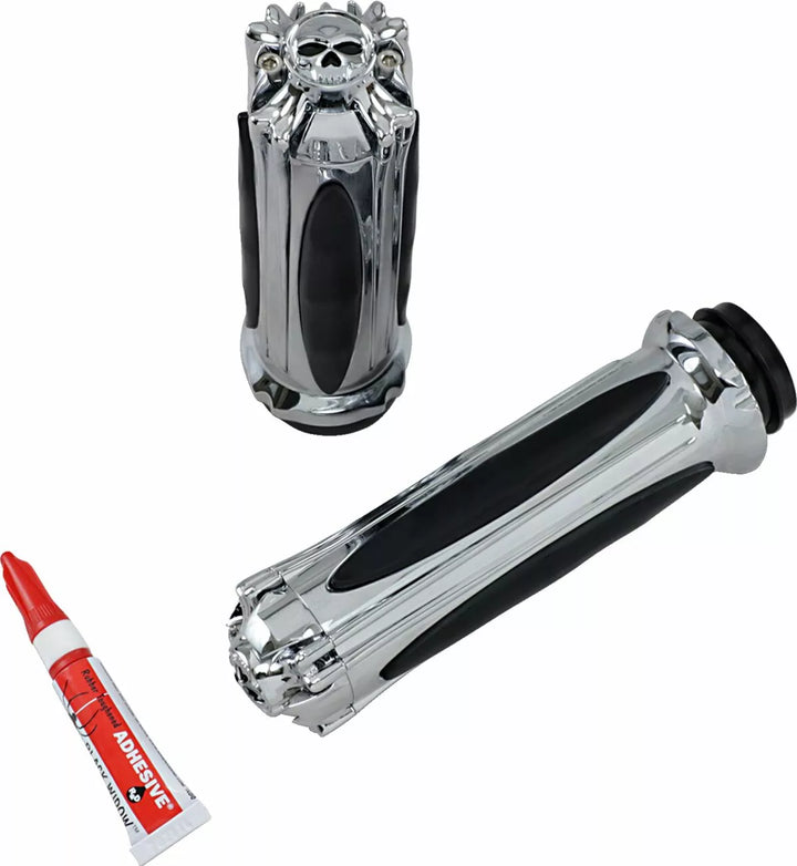 Wicked Looks, Wicked Comfort, Grip Bodies sind glatt Chrom mit vibrationsabsorbierenden Gummi-Einsätzen, Zombie-Endkappen verbessern den Look, Premium-Zombie-Griffe umfassen Drosselklappen Boss