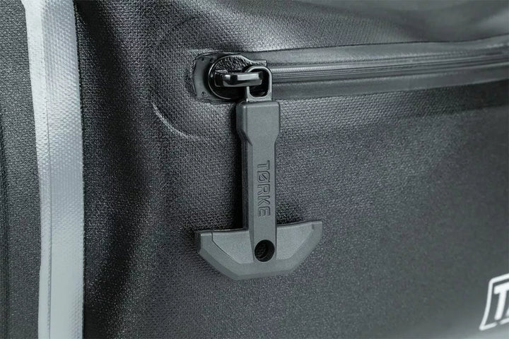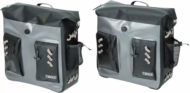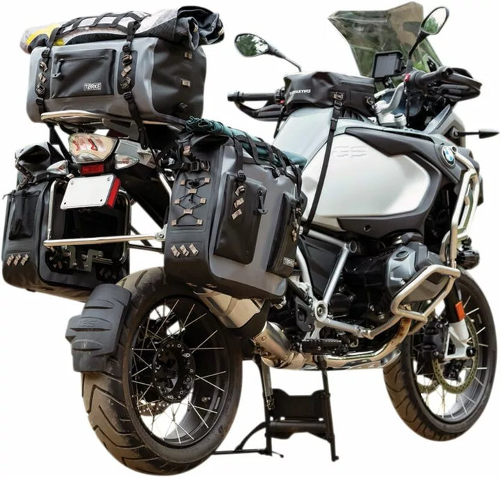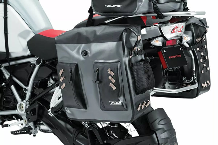 Tørke 24l Dry Panniers Are Extremely Lightweight, Fully Waterproof, RF-Welded Double-Coated TPU Construction, Submersible IPX7-rated Zippers with Bockable Pulls, Removable Hi-Vis Internal Support Structure with Hook-LOOP-LOOP-&-LOOP-&-LOOP-LOOP-&-LOP-LOOK WITH HOOK- Pockets for Laptop or Tablet Storage, Integrated AI/Purge Valve, External Waterproof Storage Beutel mit IPX7-Reißverschlusszügeln mit IPX7-Reißverschluss, umfasst das vollständige Montage-Gurt-Kit und abnehmbare Frachtnetze für den Außenlager, Wurf und Variation variieren mit vollem Mountspunkten, der für die Verwendung mit Satteltaschen-Stützklammern empfohlen wird, wenn sich ein sicheres Vier-Punkte-Montage-Gurtsystem nicht erreicht werden kann.