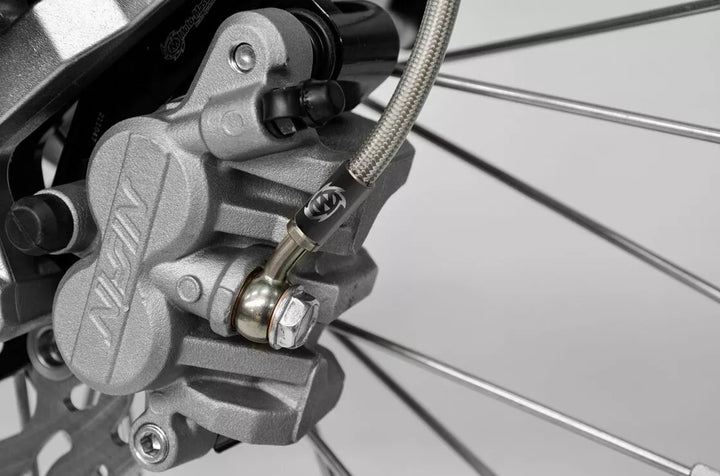 PTFE -Schlauchauskleidung mit einem kabelgebundenen Docke aus rostfreiem Stahl, das durch eine haltbare und leichte PVC -Abdeckung geschützt ist. Edelstahlbanjos werden verwendet, um mögliche Korrosion zu beseitigen. Anweisungen. Edelstahl geflochtene Bremsleitungen beseitigen das schwammige Gefühl von Standard -Plastikbremslinien.
