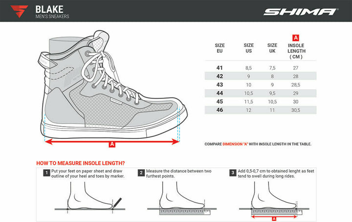 Shima Blake -Sneaker haben eine diskret gestaltete reflektierende Paneel auf der Rückseite, um Sichtbarkeit nach Einbruch der Dunkelheit zu gewährleisten. Wir können sogar sagen, dass das Paneel verborgen ist, da es tagsüber schwer zu erkennen ist. Für perfekte Präzision bei den Stiefeln hat die Sohle einen Grip-Deboss im Bereich. Dieses Modell wurde für Komfort und einen stilvollen Look entworfen. Besondere Zuglaschen und ein Reißverschluss an der Seite wurden entworfen, um maximalen Komfort beim An- und Ausziehen zu bieten. BLAKE -Leder -Sneaker sind eine moderne Version des klassischen Motorradsneakers. Haltbar und modern, dies ist eine ausgezeichnete Wahl für dauerhaften Komfort.