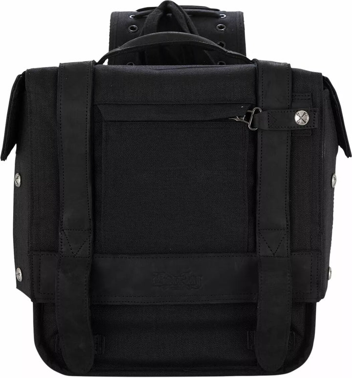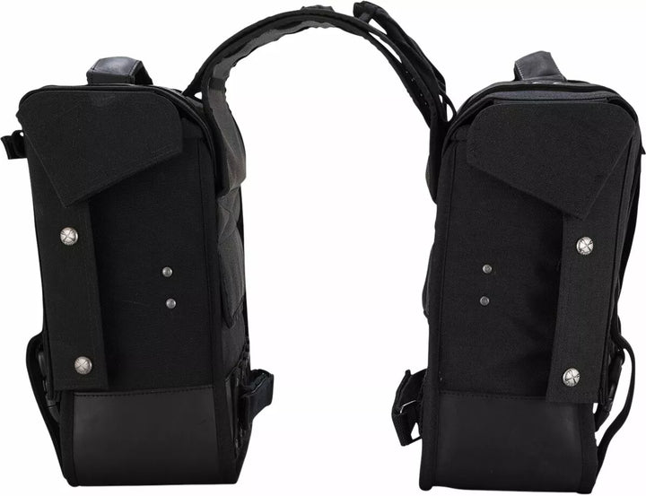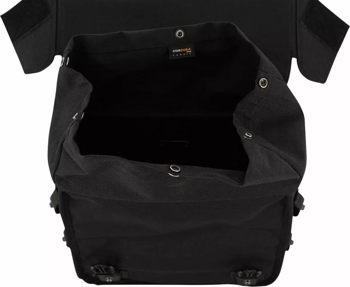 Roll-Top-Verschluss und Schnapp-/Haken-und-Schleifen-Geschwindigkeitsgeschwindigkeitsschnallen und Reißverschluss, Anti-Flail-Snap-System, einstellbarer Joch-Center-Abschnitt, der die beiden Taschen zusammenhält, breitete oder verengte.