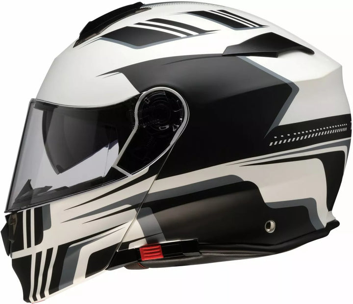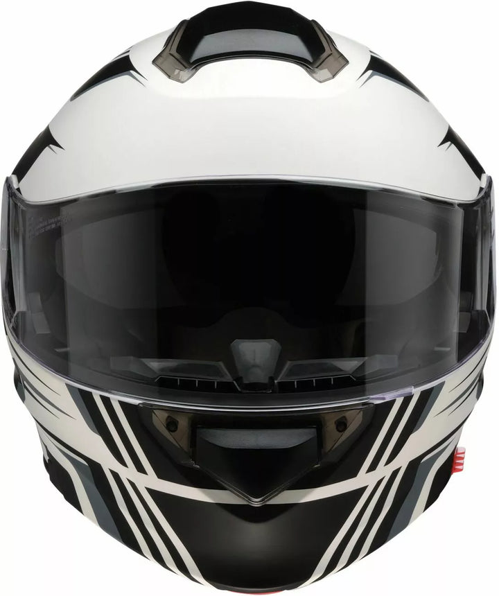 Injektionsgefühlte Polycarbonatschale, schließbares Kinn und Oberflächen sowie hintere Auspuffentlüftung ermöglichen einen erhöhten Luftstrom, leicht zu entfernen, kratzfest, im Anti-Fog-Polycarbonat-Gesichtsschutz, vollständig entfernbarer, feuchtigkeitswachender Polyest-Sonnenvisor mit Seitenmontagentaschen für Sprecher, Mikrometer-Kinnschalter mit dem Mikrometer-Kinnschalter leicht zu bedienen.